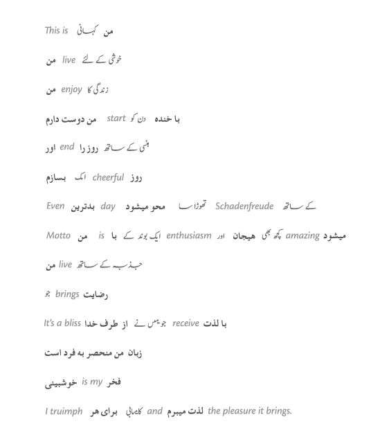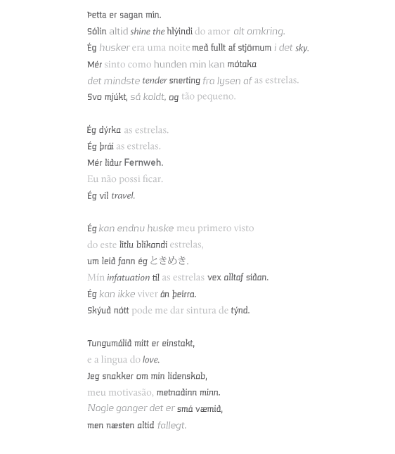 A multilingual might think why can't I talk in the way I want? Why do I always have to use the language others understand while sacrificing using a much more beautiful word in another language? Language is one of the major elements that represent our identity, why do I need to selectively avoid using the words I love and be restrained in one language? Why not use the languages more freely? To design our own aesthetically appealing language which represents our personality without being a poet, just like we dress ourselves without being a fashion designer? This project is intended to discover the new use of language - to create personalised languages for the multilingual people that would hold the maximum ability of expression emotions.
