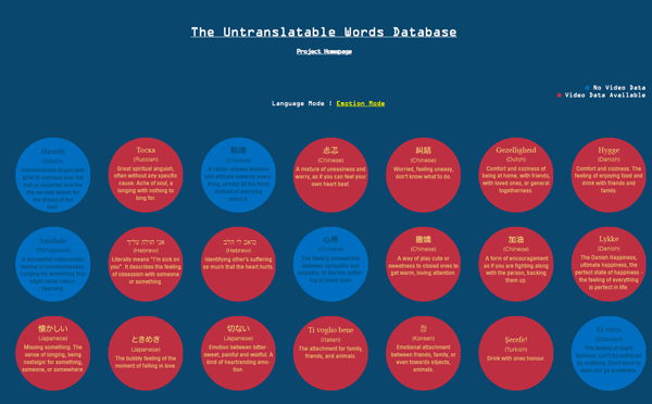 The Untranslatable Words Database is a collection of videos which people were asked to explain the untranslatable words in their native language with that lanaguage to the imaginary audience who doesn't understand the language. It is an attempt to capture the essense of the emotion-related words in different languages through voice, body language, and facial expressions.