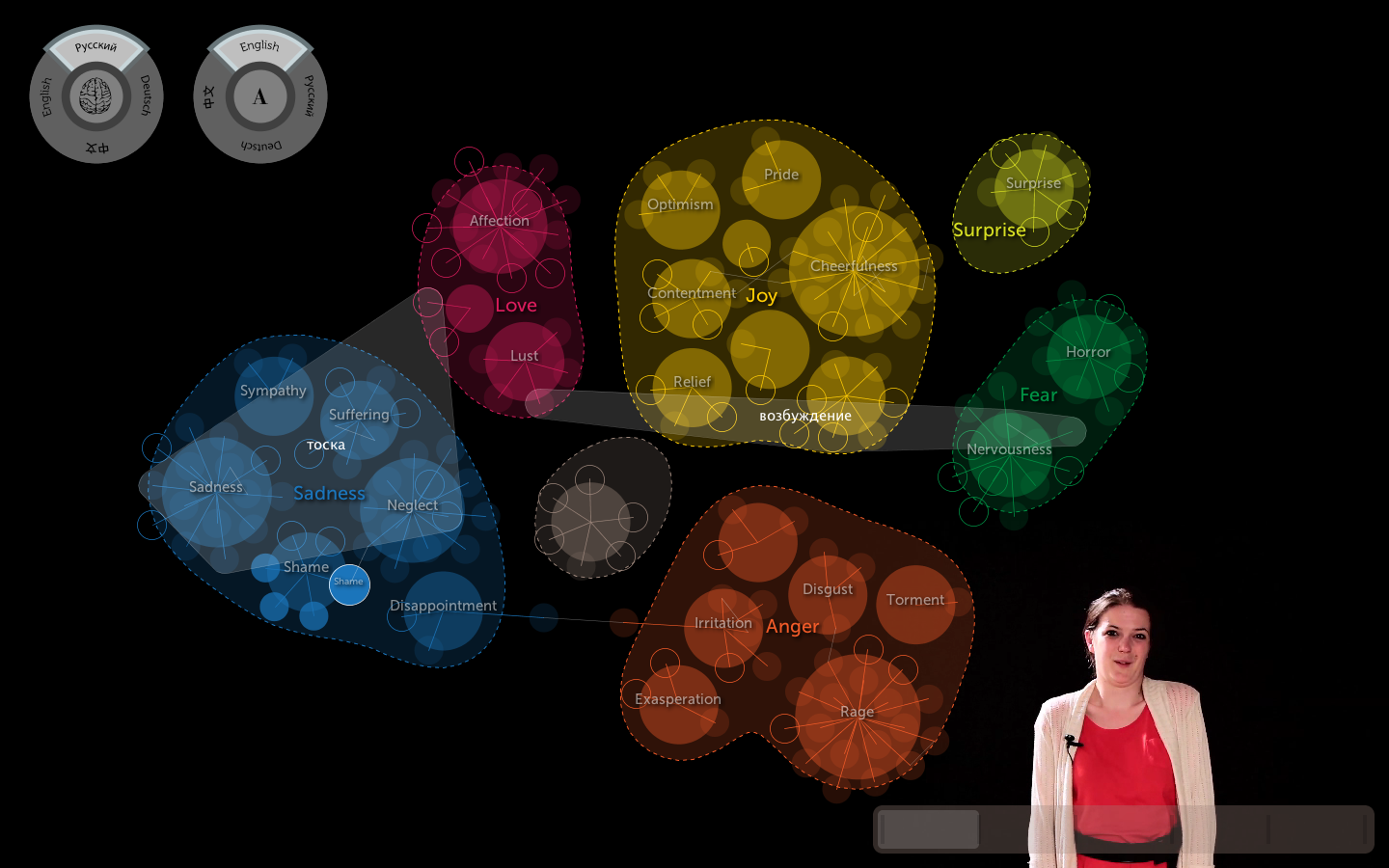 This is the extension of the untranslatable words visualisation. In order to take the visualisation further, I started to work closely with a native Russian speaker and three native German to translate the whole list of emotions, to see if they can be translated properly, or are there unique words in Chinese, Russian, or German that depicts the emotions into more precision, to come up with this "grand detail" of human emotions. It then develops into an interactive emotion archive where you can compare different emotionscape in different langauges, as well as understanding the emotions directly from facial expression, tonality, and body movements.