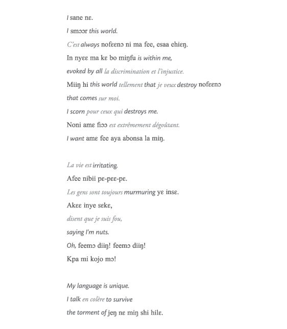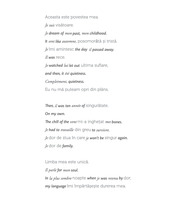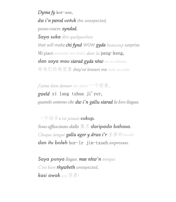 A multilingual might think why can't I talk in the way I want? Why do I always have to use the language others understand while sacrificing using a much more beautiful word in another language? Language is one of the major elements that represent our identity, why do I need to selectively avoid using the words I love and be restrained in one language? Why not use the languages more freely? To design our own aesthetically appealing language which represents our personality without being a poet, just like we dress ourselves without being a fashion designer? This project is intended to discover the new use of language - to create personalised languages for the multilingual people that would hold the maximum ability of expression emotions.
